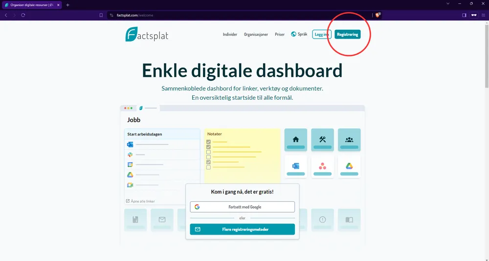 Med Factsplat kan man enkelt lage sin egen startside på internett. Her kan man lagre og finne alle linkene man trenger. Plattformen er helt gratis å bruke. Factsplat kan brukes på både PC, Nettbrett og mobil. Vi anbefaler alikavel at selve oppsettet av Factsplat gjøres på PC.